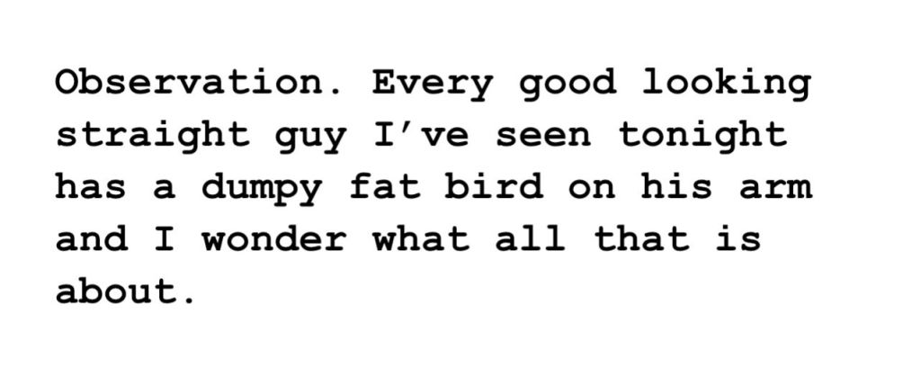I suspect that there was a reason for ignoring me. By this time I’d told my friends that I was gay, but never told you. They were happy for me whilst also being pissed off because I could have had any girl I wanted.