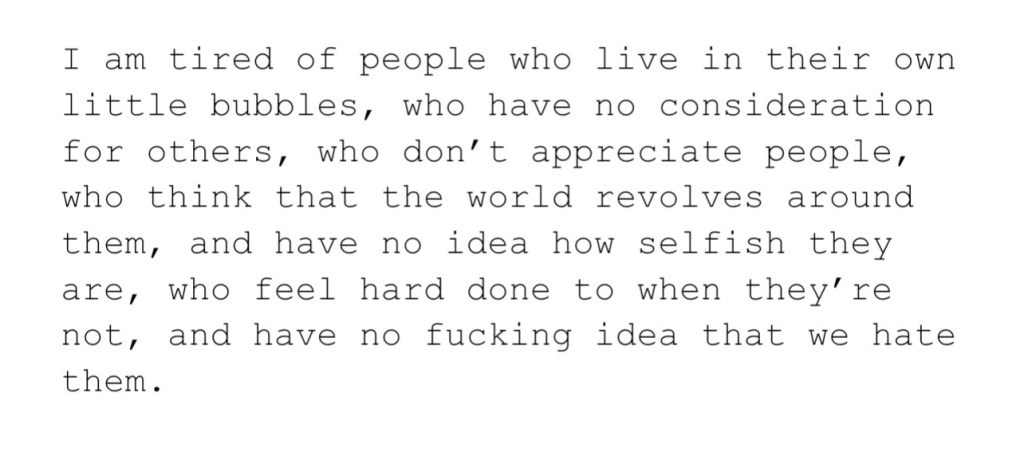 I don’t know why, but I thought about you today. I was looking through a window at a green valley that was drowning in rain. It was a battle between land and sky. You always spat on the floor and never apologised, a bit like the rain. That was just you.